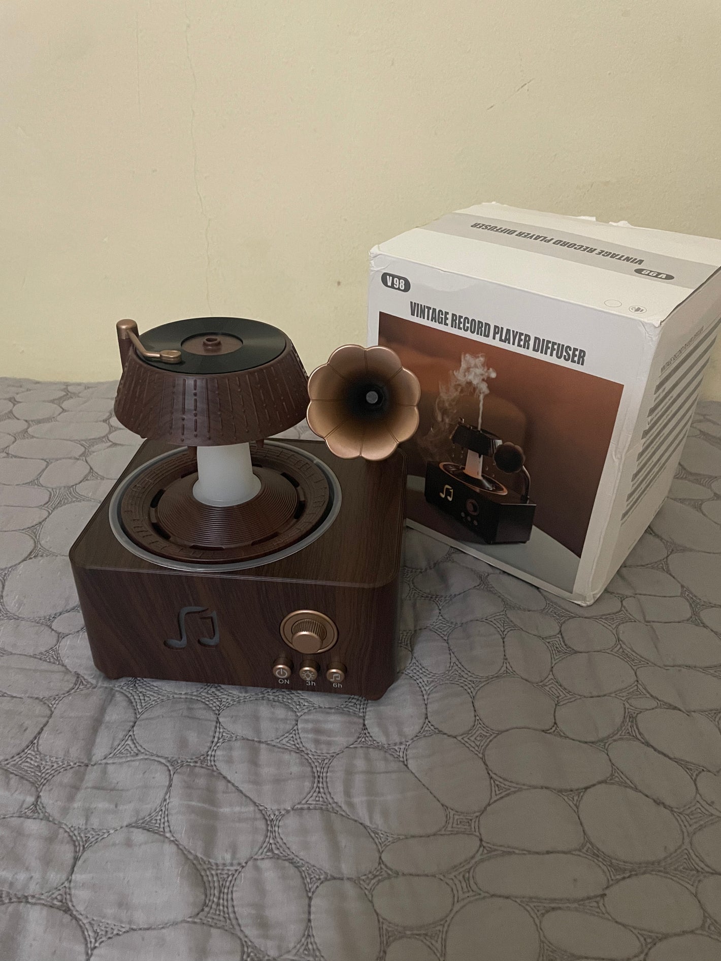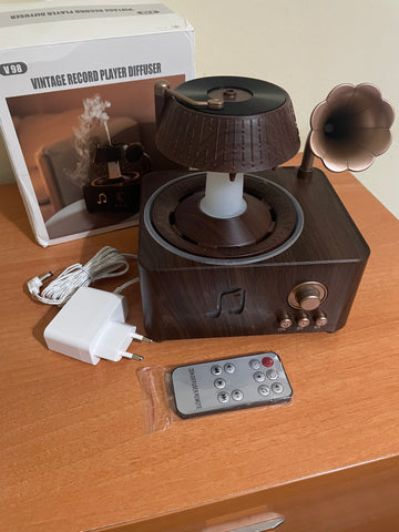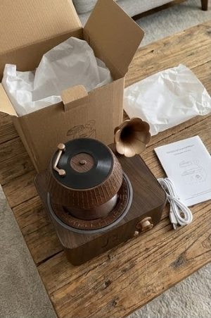 Gramophone-style rain humidifier with gentle mist, rain effect, and soft ambient light to create a relaxing atmosphere in your living room, bedroom, or office. Add a few drops of essential oil and enjoy cozier air and a calming mood in just a few minutes.